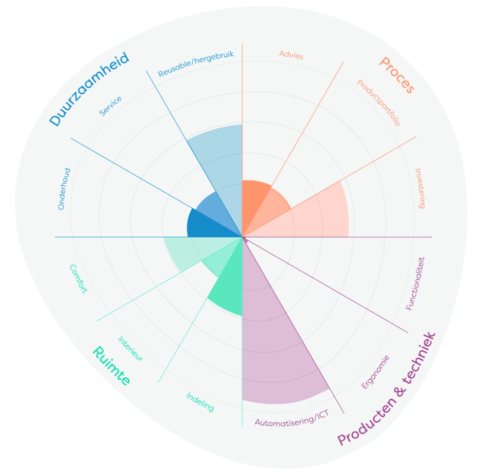 Het Clinic Complete Wheel bestaat uit vier onderdelen en is telkens opgebouwd uit drie specifieke vragen. Geef elke vraag een score op basis van hoe belangrijk je die vindt. Beoordeel de vragen op een schaal van 0 tot 5 punten: